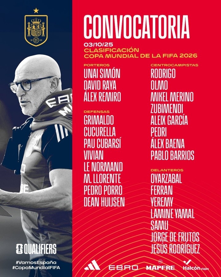 10月03日讯 西班牙队官方公布了10月份出征世预赛的球员大名单,亚马尔、佩德里等巴萨球员入选。