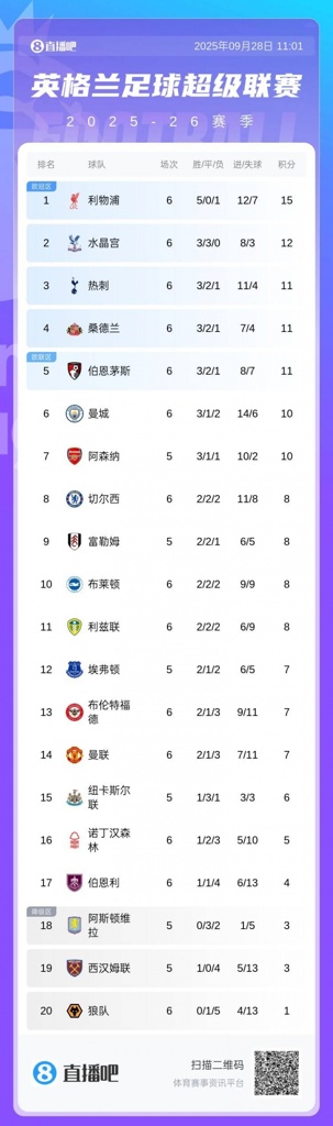 英超积分榜: