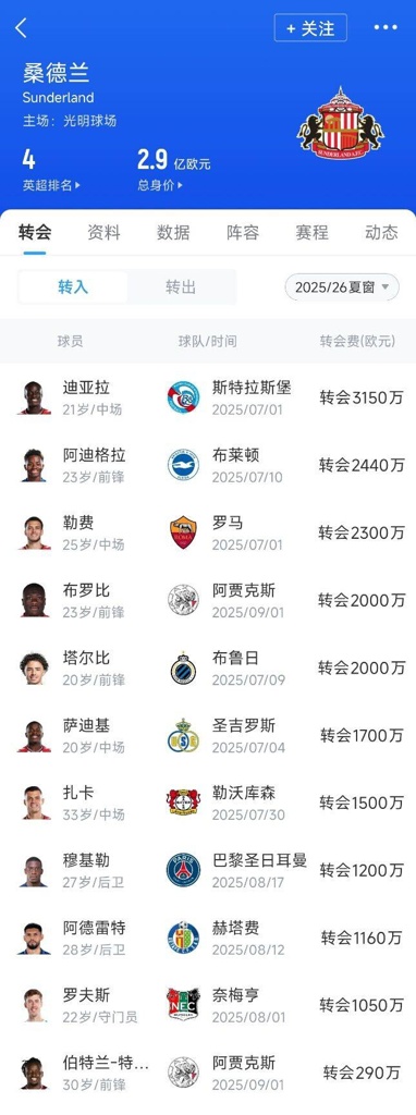 今年夏窗,作为升班马的桑德兰豪掷1.879亿欧,买入了10余名球员。新赛季征战英超的他们和上赛季判若两队,黑猫的首发,绝大多数都是今夏的新援,包括扎卡、萨迪基、勒费、塔尔比、阿德雷特、穆基勒、罗夫斯、马苏亚库等等。